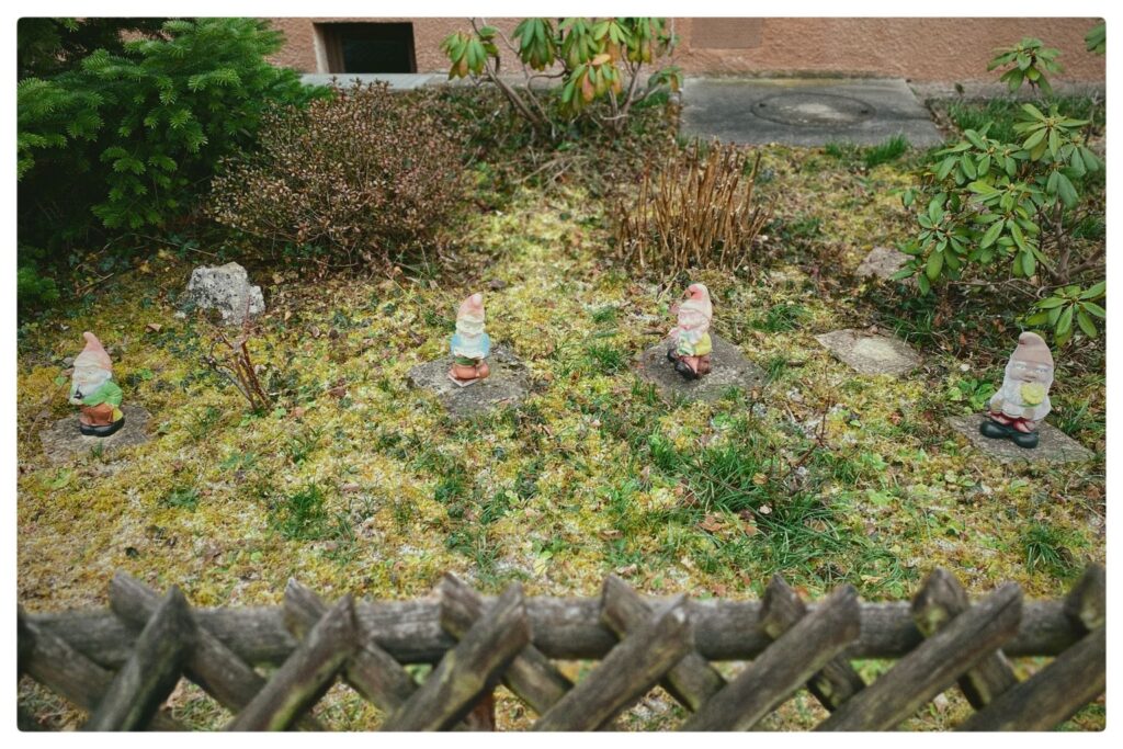Mal wieder eine Vorgartenidylle in der schwäbischen Provinz. Ob nun damals die Gebrüder Grimm diese Zwerge gemeint hatten, als sie über die sieben Zwerge geschrieben hatten? Und ob nun Schneewittchen in dem Haus wohnt, weiß ich auch nicht. Apropos – wo bitte sind die restlichen Drei?