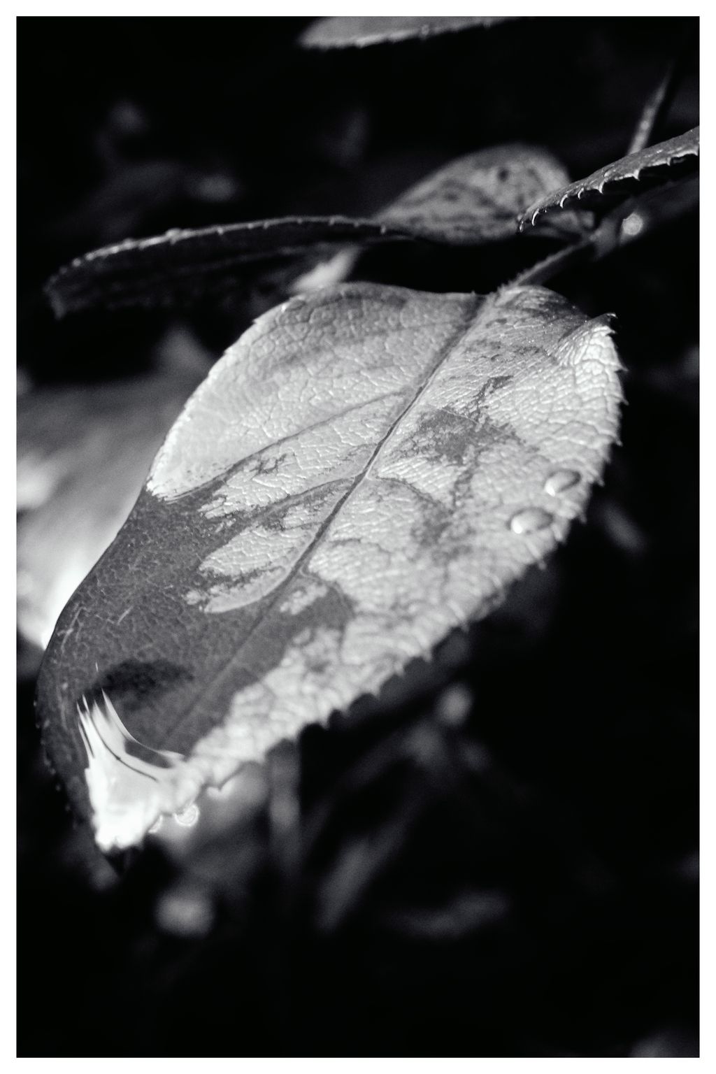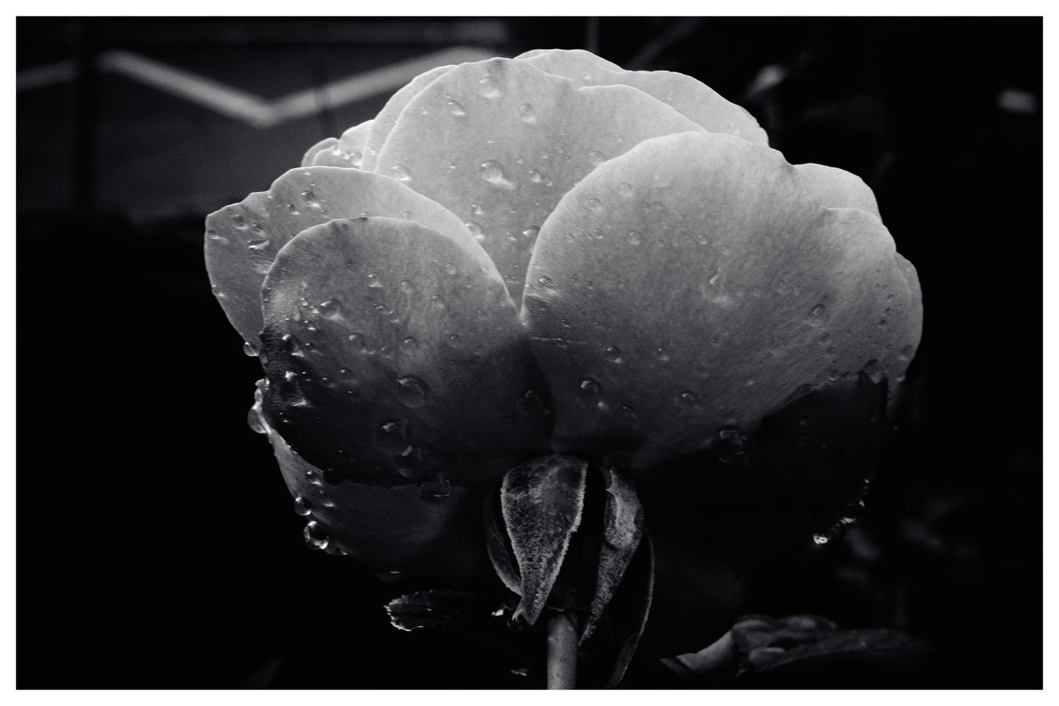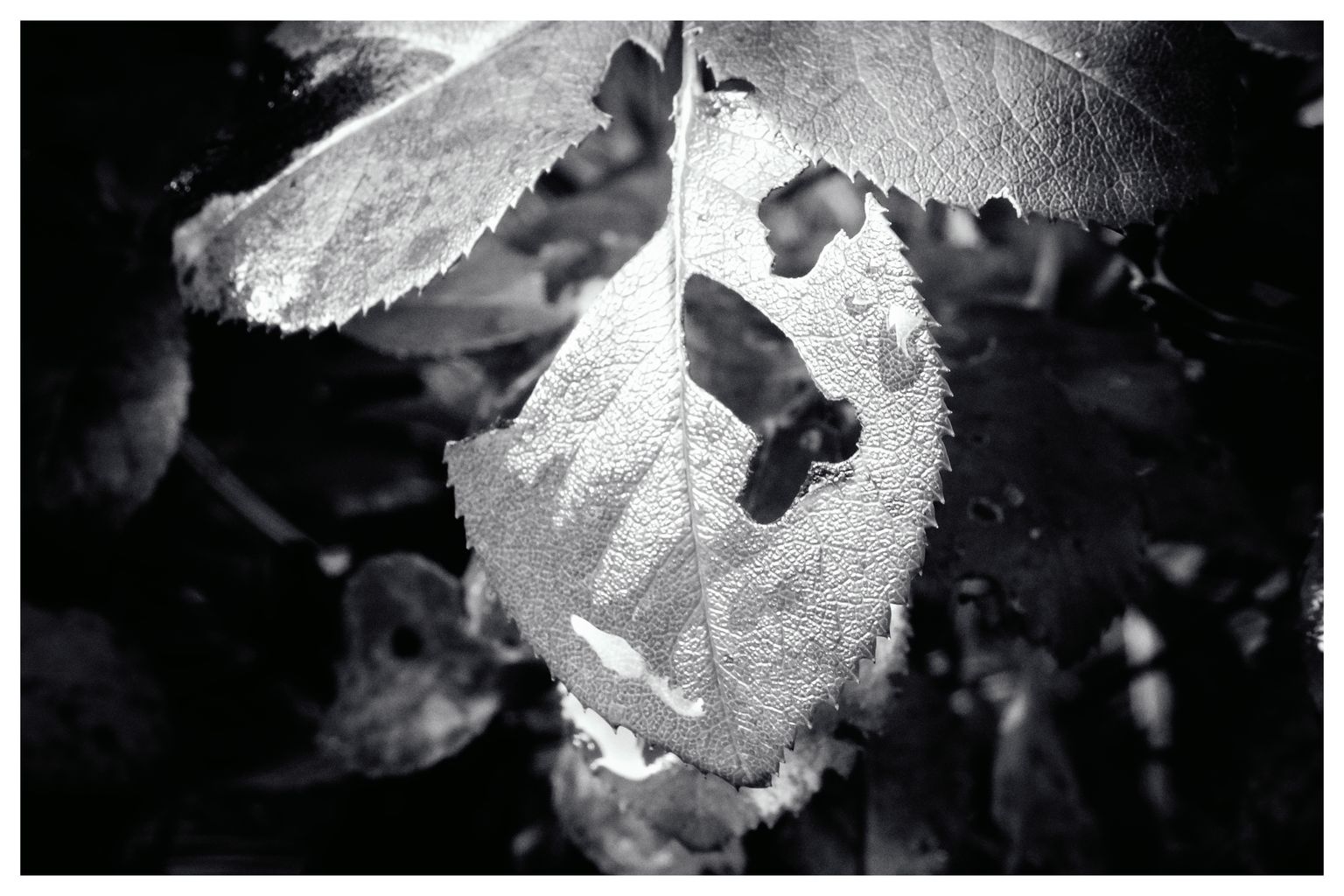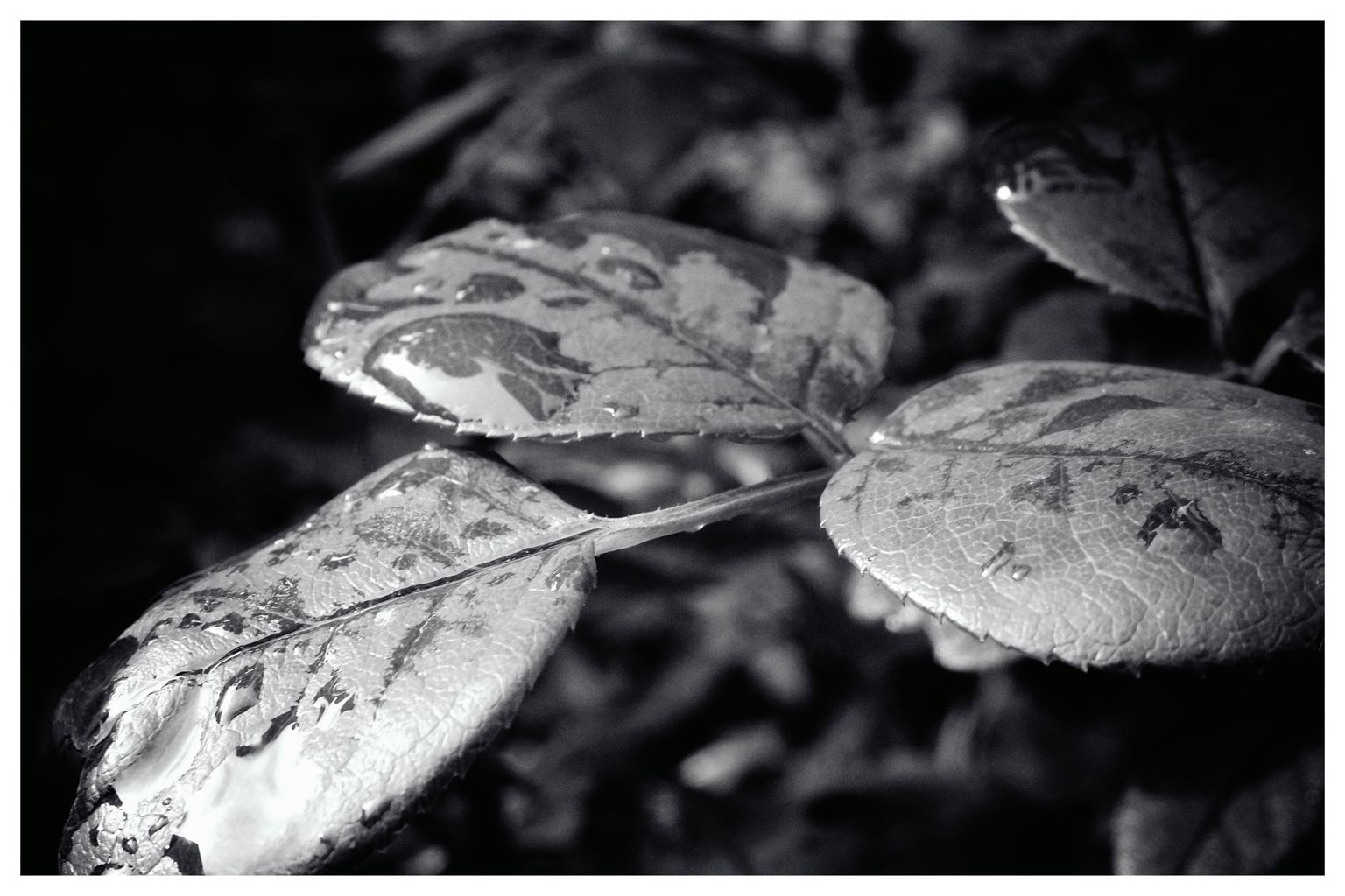 Draussen hat es bis grad eben heftig geregnet. Ich stand auf unserer überdachten Terrasse und genoss die frische, saubere, kühle Luft und schaute in unseren kleinen Minigarten. Kleine Tropfen an den Blättern des Rosenstrauchs, Minipfützen an der letzten verbliebenen Blüte. Auf einmal sah ich überall Motive, Formen, klar und abstrakt – dein Detail hier ein bisschen Kontrast da. Also schnell die kleine Sony HX90V geschnappt, Makromodus an und losfotografiert. nach wenigen Minuten waren eine gute Handvoll Bilder auf der Speicherkarte.