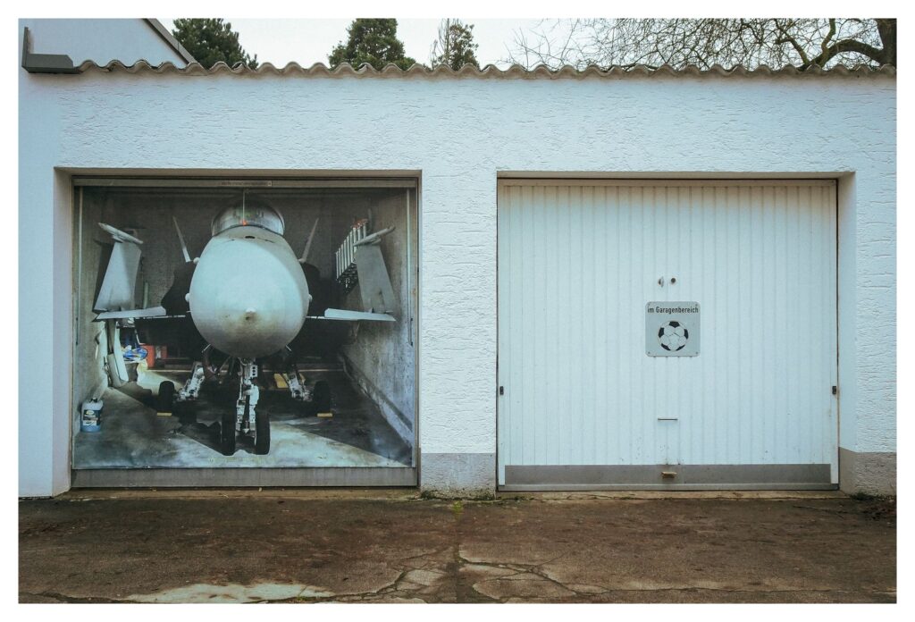 Nee im Ernst, das ist ein Poster aufgeklebt auf ein geschlossenes Garagentor. Der absolute Hingucker in der ganzen Siedlung. Geile Idee sowas – würde ja vielleicht auch weniger martialisch gehen! Vielleicht mit nem Boot oder ner F1-Karre – sofern man auf sowas steht!