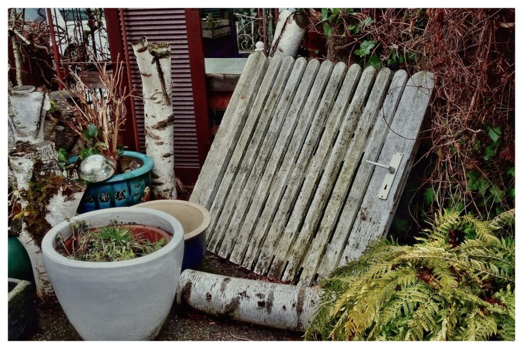 Lehnt eine Gartentür an der Wand und irgendwas steht drumrum – manche würden sagen, nein schimpfen „Chaos, Müll, Unordnung,….“, aber ich finde es hat genauso Charme . Chaos ja, aber mit pittoreskem Charme. Und das mag ich!